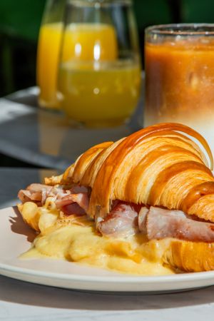 Com panificação própria e uma forte vocação para a viennoiserie, a Bossa Bakery, no Real Parque, tem o croissant como carro-chefe da casa. Produzido diariamente, o folhado aparece na vitrine para levar para casa e nos matinais, podendo ser pedido na versão simples com manteiga (R$ 21) ou requeijão (R$ 23). Entre os recheados, ganham destaque o Croissant com presunto e queijo prato (foto, R$ 28), com salmão defumado, pasta de ervas e rúcula (foto, R$ 43), e com presunto cru, tomate ralado e rúcula (R$ 36), além da versão doce com Nutella® (R$ 34).