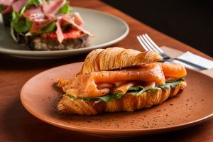 Croissaint recheado com salmão defumado, pasta de ervas e rúcula - Crédito: Vitor K. Neves